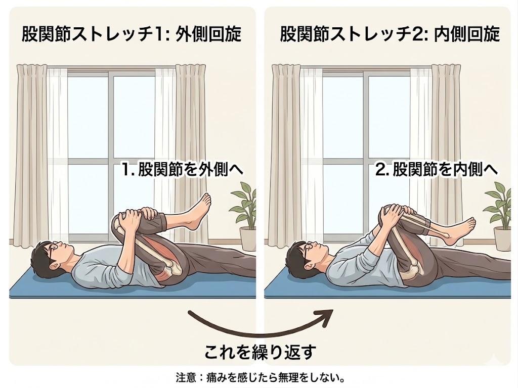 効果:股関節全体をやさしく動かし、可動域を回復させる(体が硬い方にもおすすめ)