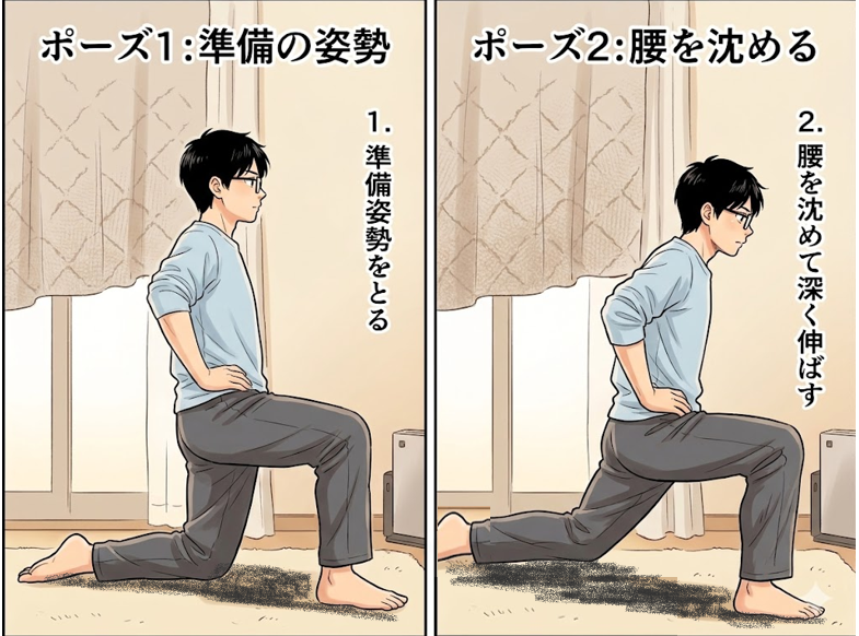 効果:腸腰筋と股関節屈筋群を伸ばし、骨盤の前傾・後傾を整える