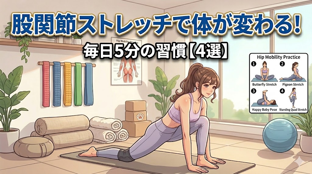 この記事では、股関節が硬くなる原因から、今日から自宅でできるストレッチ4選まで、わかりやすくご紹介します。毎日たった5分。ぜひ最後まで読んで、試してみてください。
