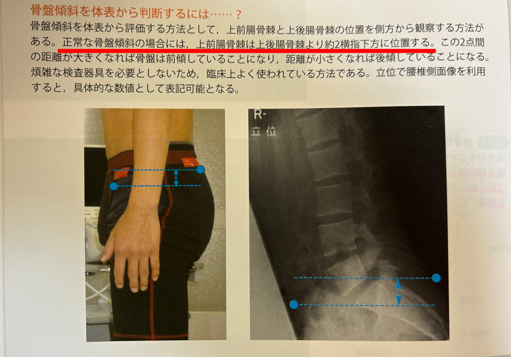 ASISとPSISを矢状面で比較し、2横指の高さの差であれば正常、それ以上なら前傾位、それよりも低い場合は後傾位と判断できます!