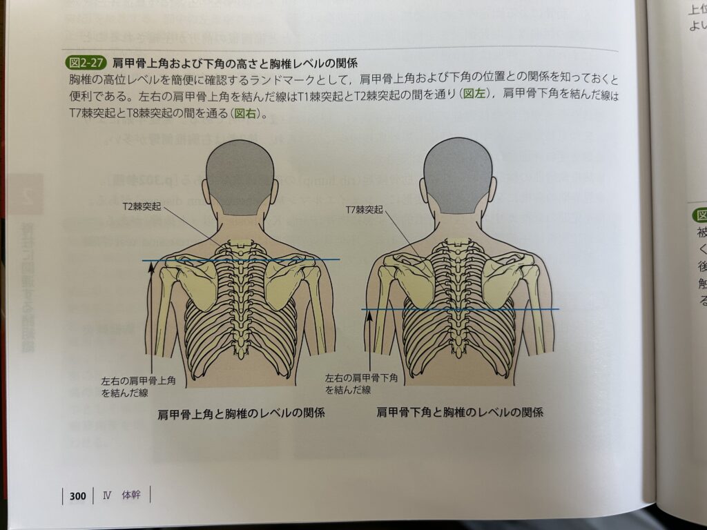 肩甲骨の下角の高さを結べば、第7胸椎棘突起に、上角の高さを結べば、第2胸椎になります。
