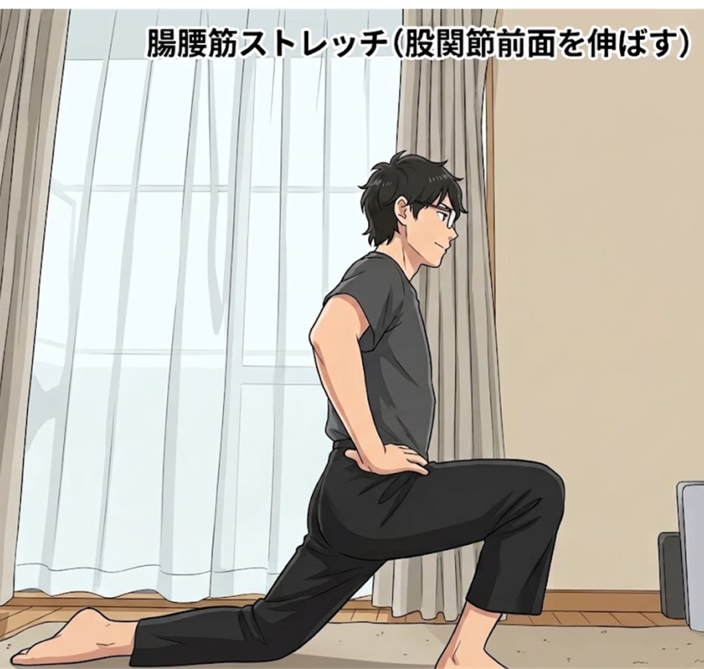 ② 股関節・胸椎のストレッチ(可動域の回復) 腰を直接伸ばすストレッチよりも、股関節前面(腸腰筋)と胸椎のストレッチを優先しましょう。これらの部位の柔軟性が上がると、腰への負担が分散され、痛みが和らぐことが多いです。1日5〜10分のストレッチで大きく変わります。