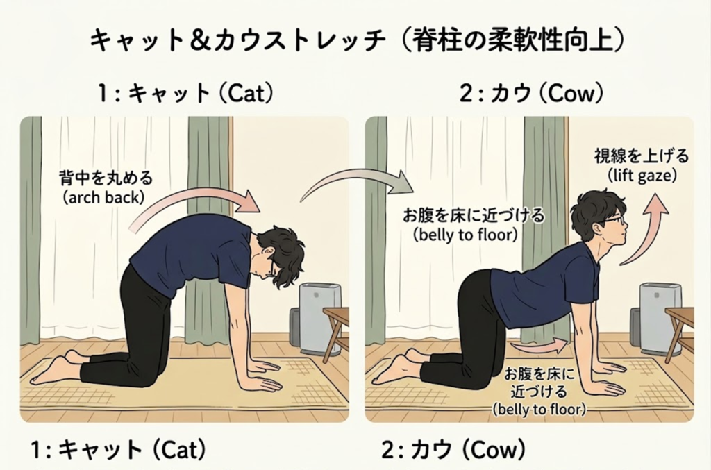 ① キャット&カウストレッチ(脊柱の柔軟性向上)