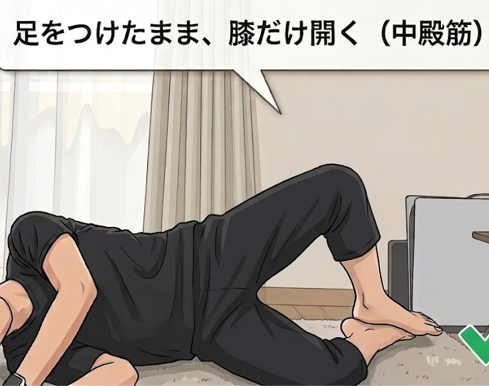 横向きに寝て、上の脚をゆっくり持ち上げる「クラムシェル(ハマグリ)エクササイズ」がおすすめです。膝を軽く曲げた状態で、お尻の横の筋肉を意識しながら10〜15回×2セット行います。お尻の筋肉(中殿筋・大殿筋)が弱いと骨盤が不安定になり腰に負担がかかります。地味に見えますが、腰痛リハビリの現場では非常に重要視されているトレーニングです。「お尻を鍛えると腰が安定する」——これが私が患者さんに最初に伝える言葉です。